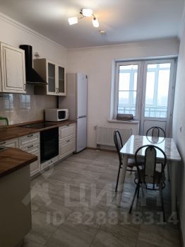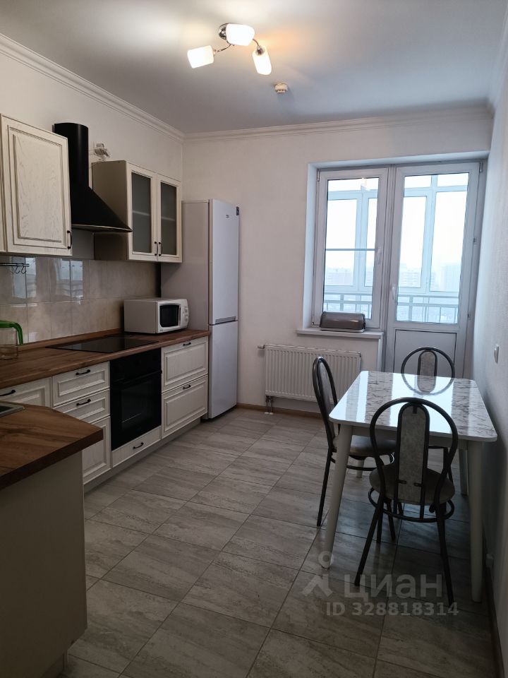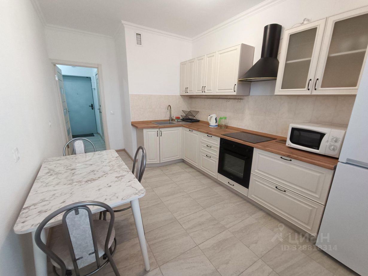 На кухне установлена встроенная мебель, с большой рабочей поверхностью, которая дополнительно освещается светодиодной лентой. Имеется вся необходимая бытовая техника - холодильник, индукционная варочная панель, духовой шкаф, микроволновая печь, электрический чайник. Выход на лоджию с панорамным остеклением осуществляется из кухни.