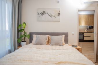 Имеется отдельная спальня с широкой кроватью с подъёмным механизмом, высоким ортопедическим матрасом и местами для хранения.