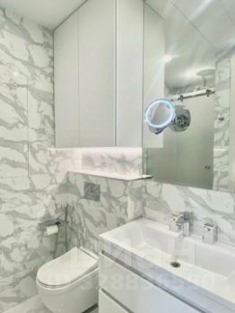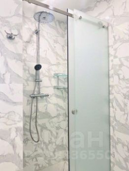 В санузле все продумано до мелочей: большая душевая кабина, душевая группа, смеситель и аксессуары Grohe, бойлер Ariston, гигиенический душ, электрический полотенцесушитель, стирально-сушильная машина Haier, косметическое зеркало с увеличением и подсветкой, тёплый пол.