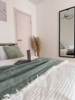 Квартира выполнена в стильной дизайнерской концепции: сочетание дерева, белых и чёрных оттенков с зелёными акцентами, что создает тёплую и уютную атмосферу. Идеально подойдёт для тех, кто ценит эстетику и комфорт.