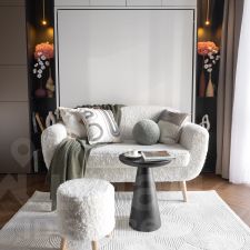 Квартира меняется благодаря встроенной системе трансформации: кровать убирается, освобождая центр комнаты, а световые сценарии переключают атмосферу.