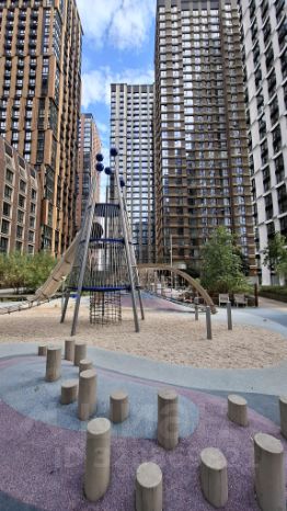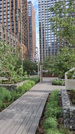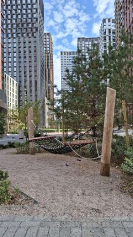 — панорамное окно с видом на благоустроенный двор.