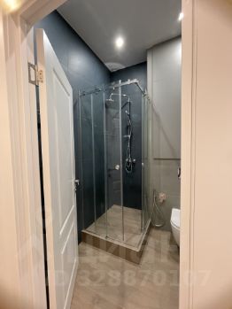 Душ со стеклянной перегородкой оснащен раздвижными дверцами, отдельная раковина, гигиенический душ, зеркало с подсветкой, электрический полотенцесушитель.