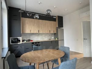 С тремя большими окнами. Оборудована встроенным гарнитуром, варочной панелью, духовым шкафом, посудомоечной машиной, микроволновкой и двухдверным холодильником.