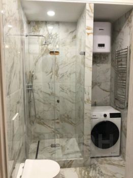 В санузле тёплый пол, душевая кабина, бойлер, стиральная машина с сушкой.