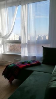 Планировка по схеме "Евродвушка" с просторной кухней-гостинной и изолированной спальней, совмещенным санузлом с ванной, панорамными окнами на лес, МГУ, Москва Сити.