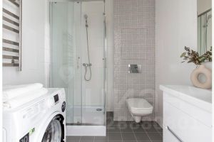 В квартире один совмещенный санузел с душевой кабиной, раковиной и зеркалом с подсветкой и стиральной машиной.