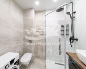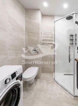 Санузел: стиральная машина, инсталляция, умывальник с тумбой, полки для хранения в душевой.