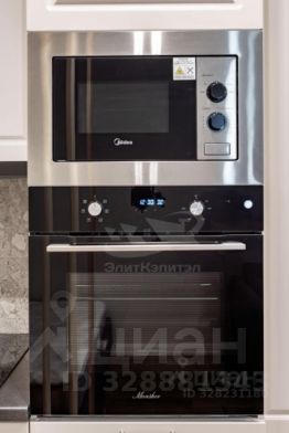Кухня: гарнитур на заказ. Встроенная техника: посудомоечная машина, холодильник, варочная панель, вытяжка, духовой шкаф, микроволновая печь. Обеденный стол и 2 мягких стула.
