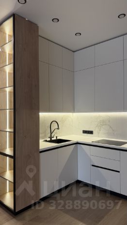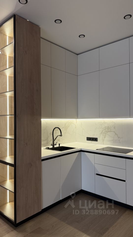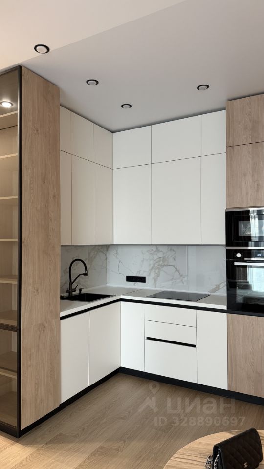 Кухня полностью оборудована: духовка, варочная панель, микроволновка — всё новое, встроенное и удобное.