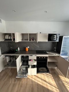 - кухня с техникой (есть посудомоечная машина, стиральная машина, встроенная микроволновая печь, отдельный духовой шкаф и холодильник);