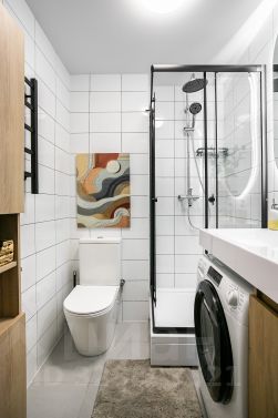 В санузле: стиральная машина с сушкой, тропический душ, зеркало с подсветкой, большая раковина, унитаз, удобные полочки для мелочей.