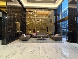 Окна квартиры выходят в великолепный закрытый внутренний двор с ландшафтным дизайном, зонами отдыха и фонтанами. Панорамное остекление. Потолки 3.1 метра.