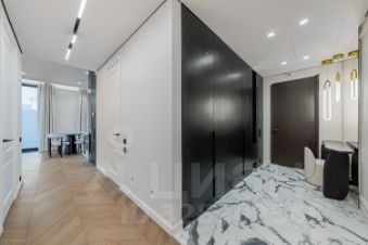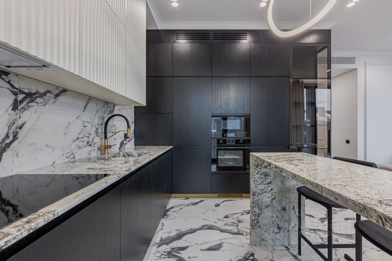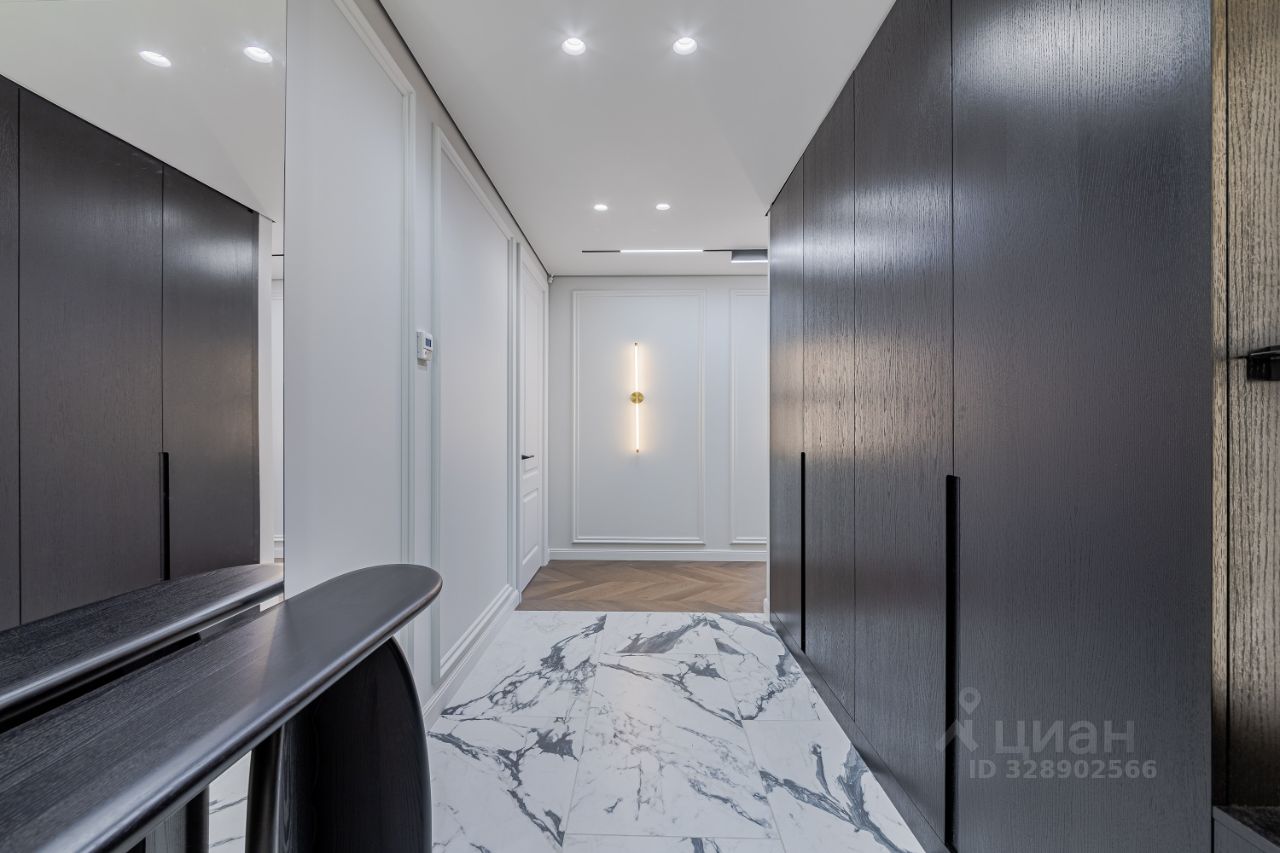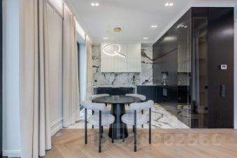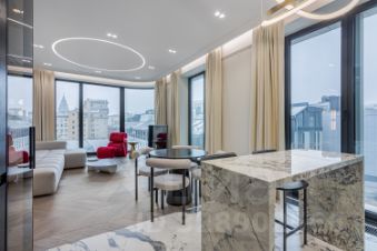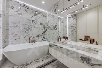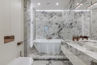 Отделка в квартире выполненная из дорогих и премиальных материалов, вся сантехника фирмы ТЕСЕ. В квартире продуманная архитектурная и инженерная концепция. Использовался натуральный камень, паркет со сложным узором.