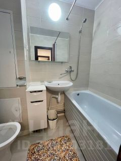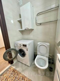 Совмещенный санузел укомплектован мебелью для хранения и корзиной для белья. Для ухода за вещами установлена стиральная машина LG.