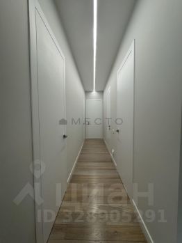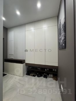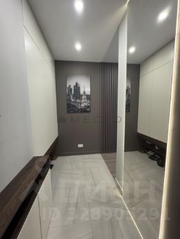 Просторный холл с зеркалом с подсветкой и встроенными шкафами
