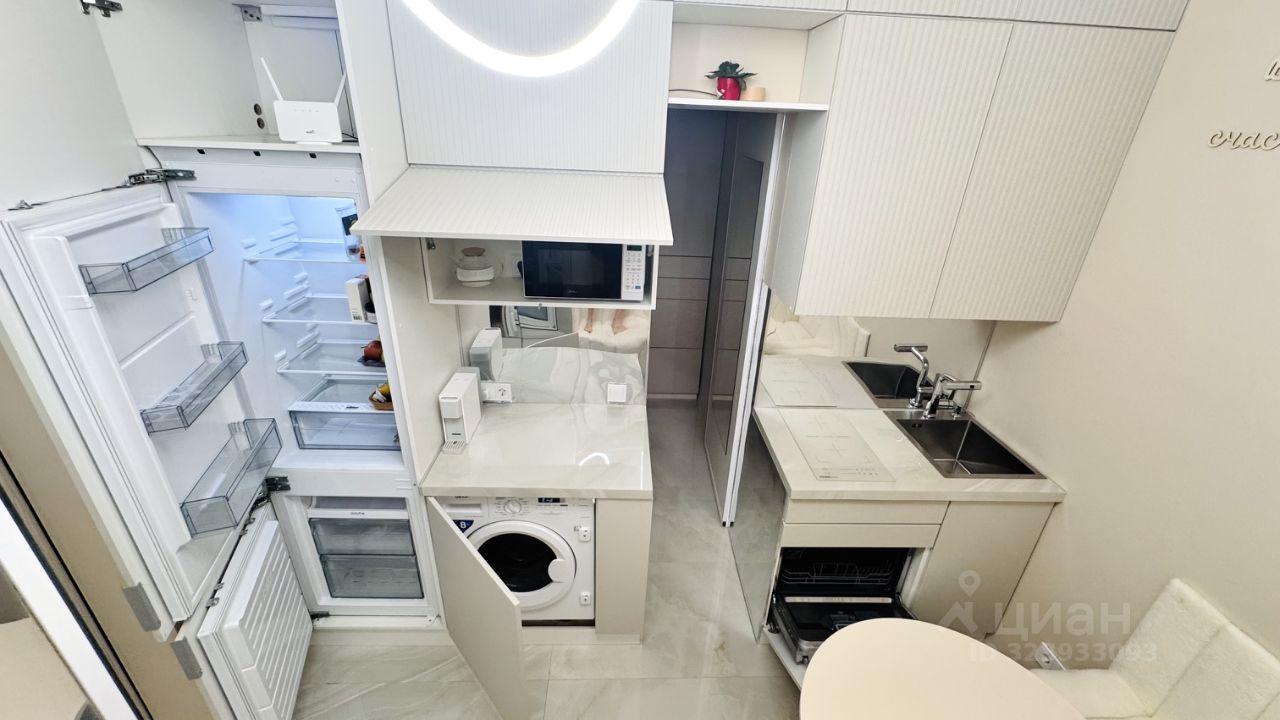 3-метровый кухонный гарнитур с полноценным встроенным холодильником с морозильной камерой, встроенной стиральной машиной с режимом сушки (больше никаких мокрых вещей, постирали, достали белье и сразу убрали в шкаф), микроволновая печь встроена в шкаф. Вместительная встроенная посудомоечная машина с 4 режимами мытья посуды. Умная индукционная плита.
