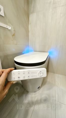 В санузле установлен современный умный унитаз, он подогревает сидение и воду для гигиенического мытья, он оснащен сушкой теплым воздухом. Есть множество режимов и настроек.