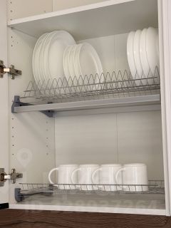На кухне есть всё необходимое для жизни — включая посуду и столовые приборы.