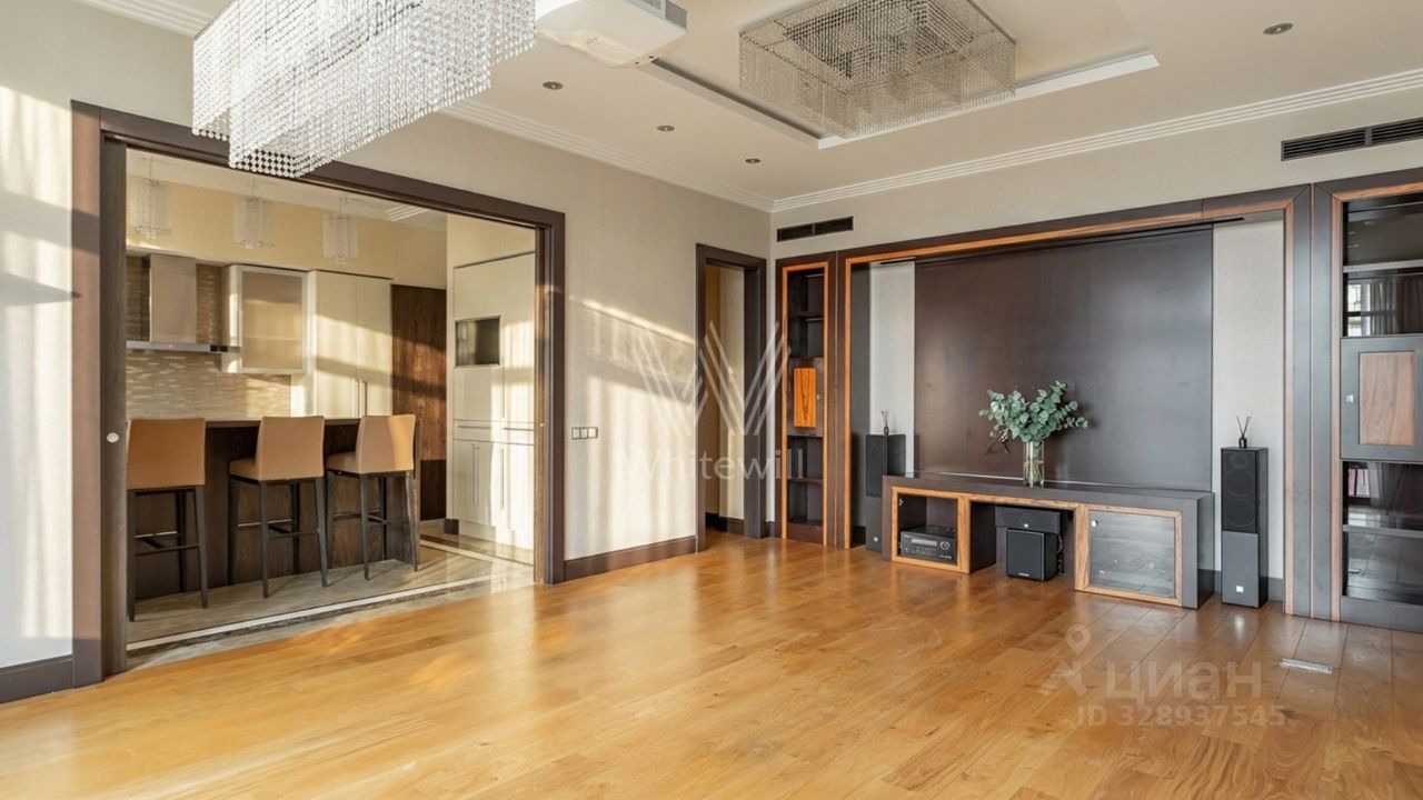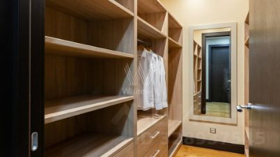 Спланирована гостиная с выходом на балкон, кухня-столовая с островом, мастер-спальня с 2 ванными комнатами и 2 гардеробными, приватный блок из 3 спален с ванной комнатой и гардеробной, кабинет, санузел с душем, постирочная, холл, открытый балкон. Квартира укомплектована мебелью и полностью оборудована бытовой техникой.