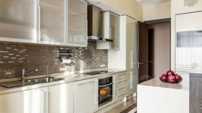 Интерьер оформлен в современном стиле в лаконичных светлых тонах.