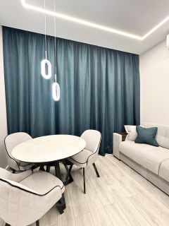 Квартира выполнена в современном дизайнерском стиле и полностью готова к проживанию. В просторной кухне площадью 10 кв. м есть вся необходимая мебель и техника: холодильник, посудомоечная машина, стиральная машина и кондиционер. В гостиной установлен телевизор, а в спальне — удобная мебель для комфортного отдыха. Санузел совмещённый, оборудован современной душевой кабиной.