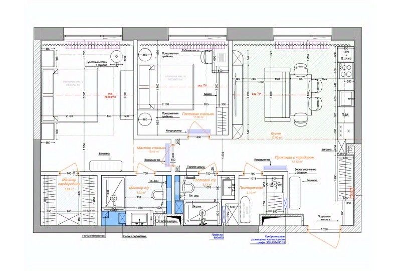 - Гардеробная + Встроенные шкафы (в спальне + в гостиной) + Антресольные шкафы и обувница в прихожей - отвечают за хранение ваших вещей