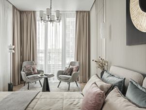 Квартира удобной планировки с тремя комнатами (спальня, кабинет и большая кухня - гостиная) с видом из окна на реку и Москва-Сити в жилом комплексе бизнес класса Западный Порт в 5 минутах от Москва Сити и метро Фили.