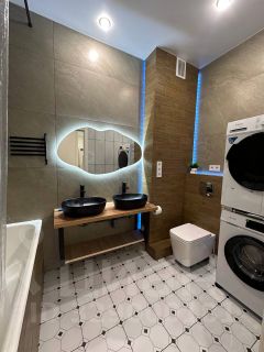 В излюбленной всеми кухне-гостиной можно вспомнить места где уже побывали или помечтать и запланировать новые путешествия, а также можно удобно разместить сидя 12 человек, а при необходимости и больше. Пространство позволяет организовать как спокойный семейный ужин, так и веселую активную вечеринку. Места хватит всем!) В гостиной установлен проектор и музыкальные колонки с продуманным звуком и освещением. Удобные увеличенные, поддерживающие стулья и высокий ортопедический диван фирмы Сокруз добавят комфорта Вашему отдыху, а домашние помощники в виде посудомоечной, стиральной и сушильной машин, моющего робота-пылесоса освободят Ваше драгоценнейшее время.