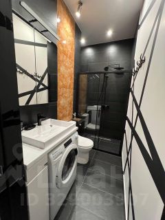 Ванная комната имеет душевую кабину, подогрев пола, стиральную машину и необходимую мебель.