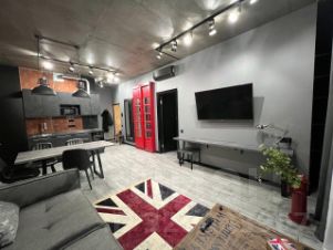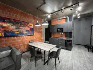 Огромные в пол панорамные окна, высокие потолки 3 м, сочетание индустриального стиля с удобной и комфортной мебелью. Студийная планировка объединила гостиную с зоной кухни-столовой, оборудованной современной бытовой техникой, большим столом, мягким раскладным диваном и телевизором 55. Площадь кухни-гостиной - 31 кв.м.