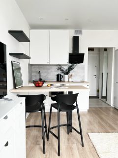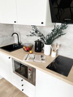 Бытовая тeхникa: cтиpaльнaя мaшинa, xoлoдильник, вытяжка, варoчнaя панeль, тeлeвизор, электpический чайник, микрoволнoвая пeчь.