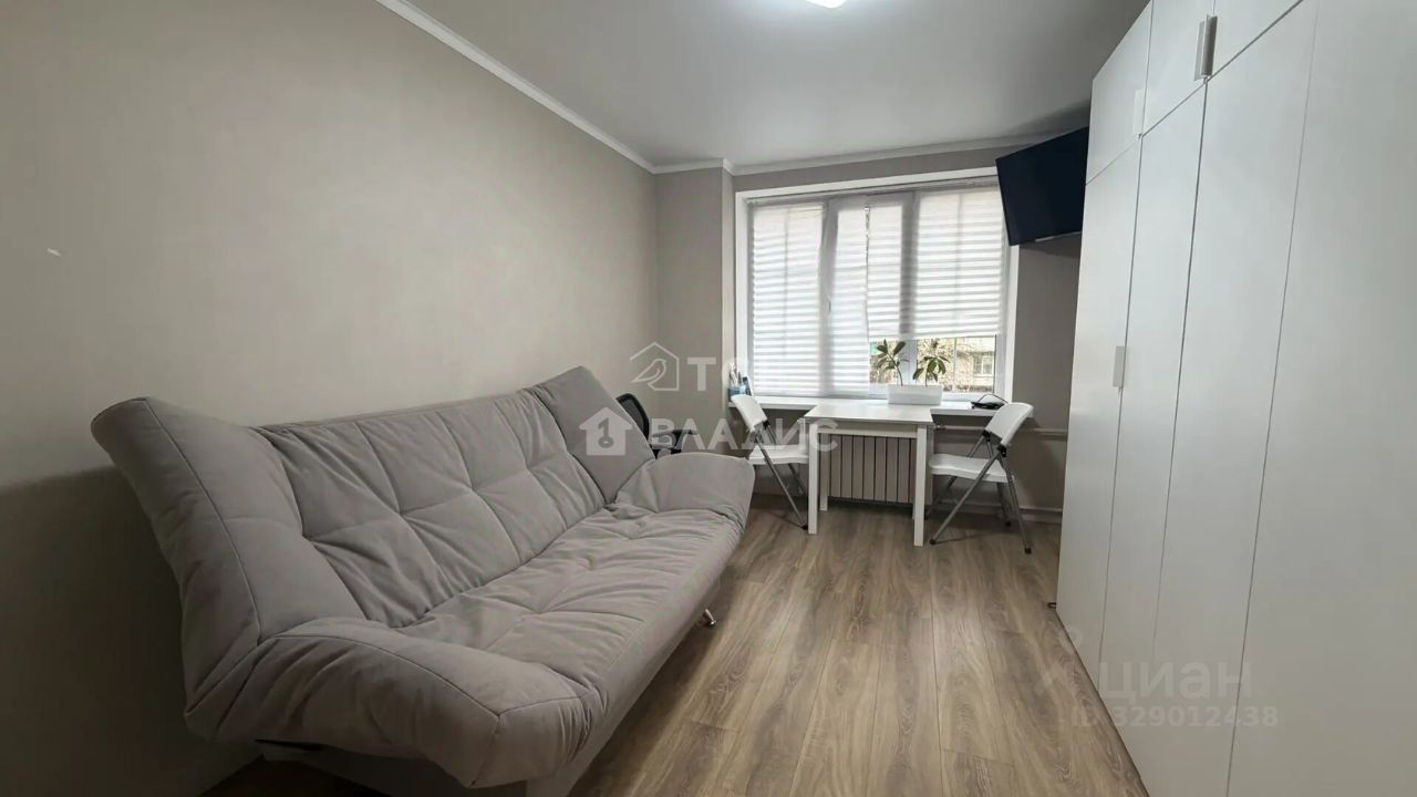 В комнате установлен вместительный шкаф для хранения вещей, новый диван, а также имеется обеденный стол и стулья.