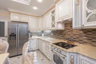 На кухне большой холодильник, посудомоечная машинка, стиральная машинка с функцией сушки, электроплита,духовой шкаф, микроволновая печь.