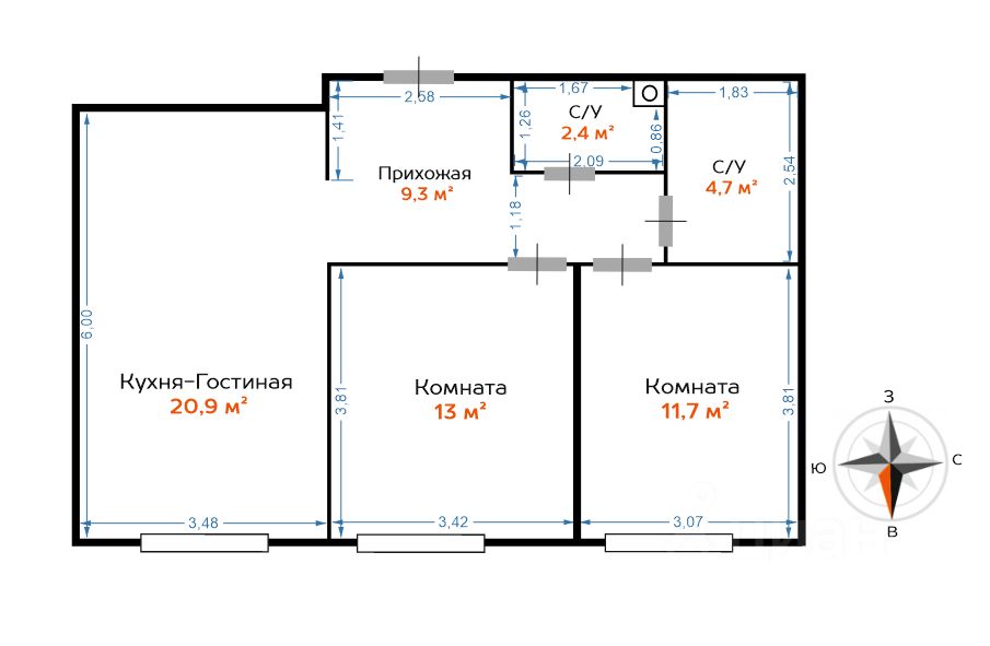 В квартире - 2 изолированные спальни и кухнягостиная, 2 санузла, удобные системы хранения.