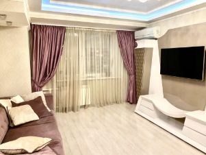 В квартире сделан современный евроремонт. Просторные комнаты меблированы, на кухне установлен полный комплект мебели и техники, включая холодильник, посудомоечную машину и кондиционер. Ванная комната оборудована ванной, стиральной машиной и совмещена с санузлом. В гостиной установлен телевизор. Также имеется лоджия для комфортного отдыха.