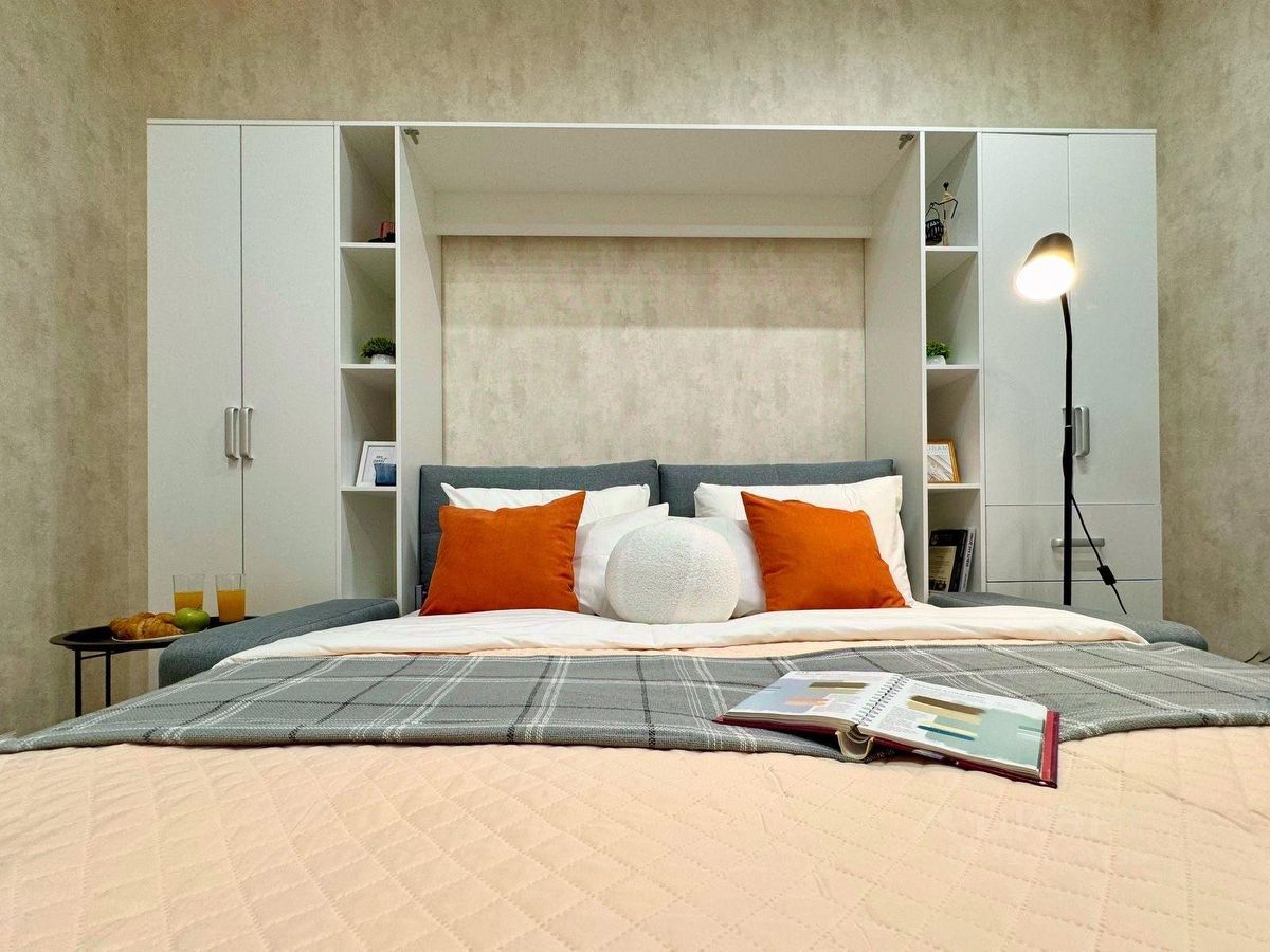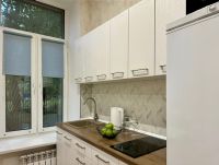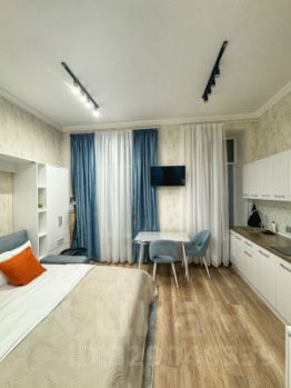 В квартире есть все необходимое для комфортного проживания: холодильник, телевизор и стиральная машина. Установлена душевая кабина, что особенно удобно для небольшого пространства. Дизайнерский ремонт делает эту студию стильной и современной.