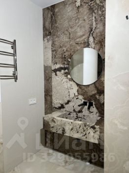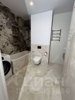 Крупноформатная плитка под мрамор/оникс, контрастная тёмная стена у ванны и душа, встроенные ниши со стеклянными полками. Ванна, тропический душ и ручной душ, подвесной унитаз с инсталляцией, полотенцесушитель, стиральная машина.
