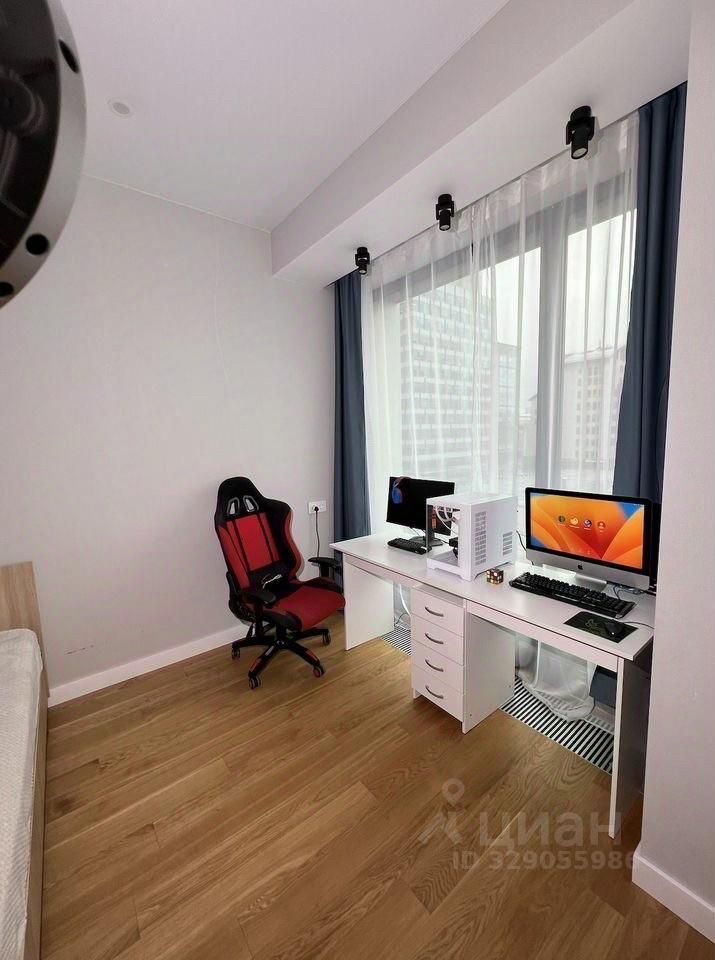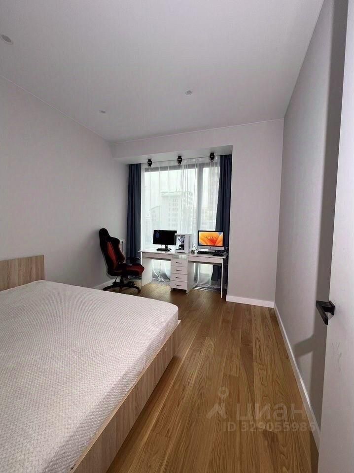 Отдельная комната с большой кроватью 2 метра в ширину и 2 метра в длину (мягкое изголовье, спокойные текстильные акценты) и декоративной мебелью. Во второй зоне — полноценное рабочее место у панорамного окна: широкий белый стол с ящиками под два монитора, ПК над окном — трековые споты. Удобно и для удалённой работы, и для жизни.