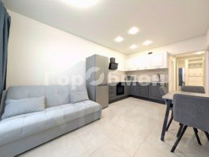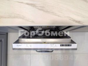 Просторная кухня-гостиная укомплектована современным гарнитуром и всей необходимой техникой: посудомоечная машина, холодильник, варочная панель, духовой шкаф, микроволновая печь, чайник, вытяжка. Для отдыха установлен удобный диван и обеденная группа.