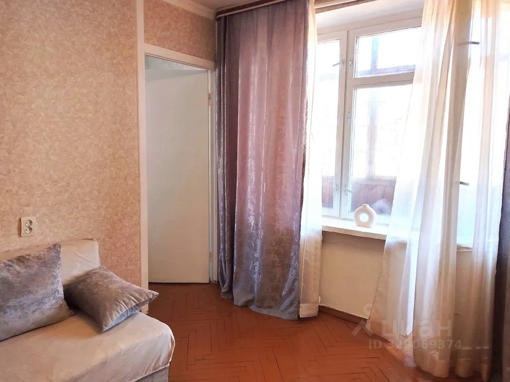 Чистая уютная двухкомнатная квартира (комнаты смежные) с балконом в кирпичном доме, общей площадью 34 кв. м. Окна выходят на тихий зеленый двор с общественной парковкой.