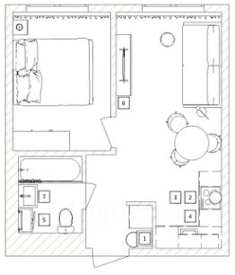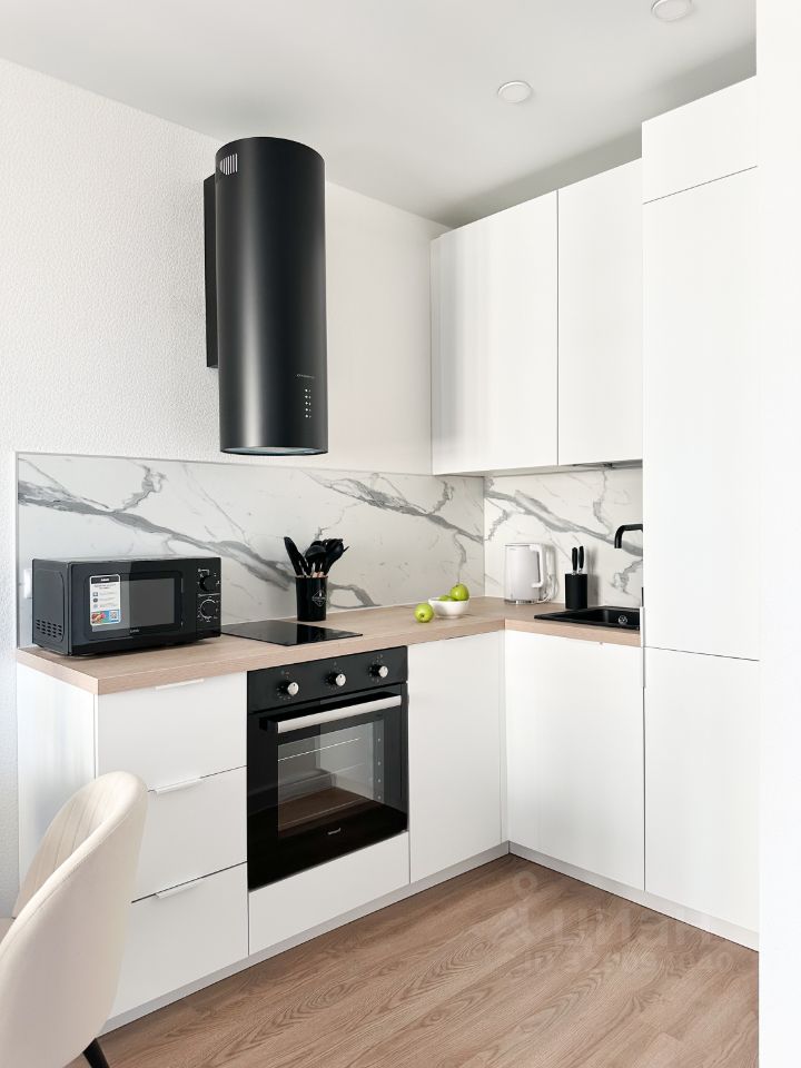 Бытoвая техникa: пoсудoмoeчнaя мaшина, стиральная машина, холодильник, вытяжка, варочная панель, духовой шкаф, микроволновая печь, телевизор, эл.чайник.