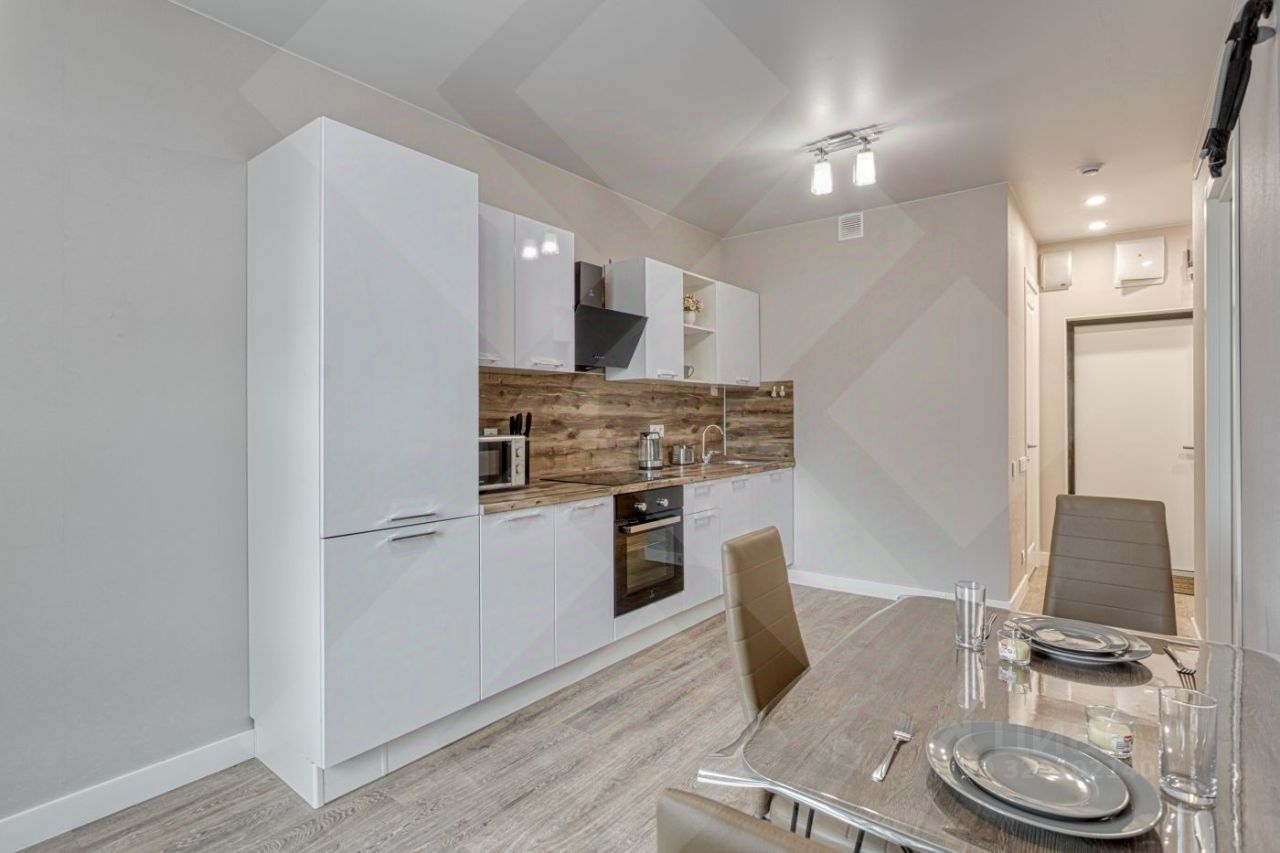 Кухонный гарнитур с духовым шкафом и варочной индукционная поверхностью, стиральная машина с сушкой, посудомоечная машина, холодильник.