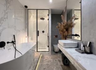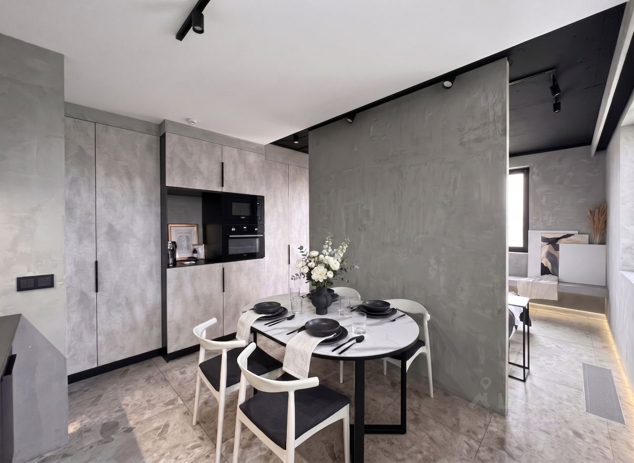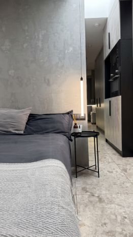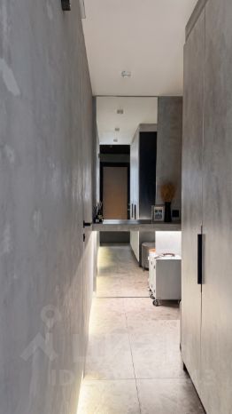 Интерьер от известного дизайн бюро. В проекте использовали дорогие материалы: архитектурный бетон, мрамор, крупноформатный керамогранит, умный свет.