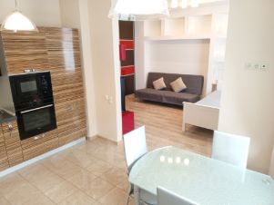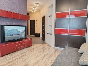 Просторная квартира с евроремонтом в ЖК "Гранд Парк". В квартире есть вся необходимая мебель и техника. Имеется также меблированная гардеробная комната. Полы в коридоре и кухне плитка, в комнате ламинат. В коридоре, санузле и на кухне полы с подогревом. Из кухни выход на застеклённую лоджию. Все окна стеклопакет. В квартире есть кондиционер, посуд. маш., дух. шкаф, микр. печь, вароч. панель, вытяжка, два плазм. телевизора, большая стир. маш., бойлер и прочее. Диван раскладной. Ширина матраца на двуспальной кровати 160 см.