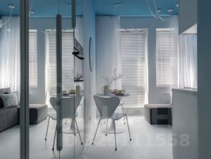 Дизайн выполнен в стиле минимализм. Визуальная гамма с растяжкой цвета от белого к голубому создает ощущение вида на море.