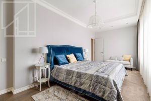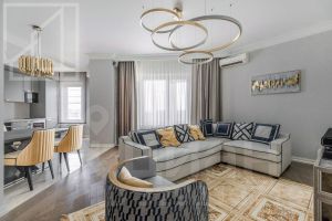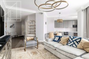 Планировка: просторная кухня-гостиная с обеденной зоной, спальня, жилая комната (можно использовать как спальню или кабинет), гардеробная комната, два совмещенных санузла с ванной и душевой кабиной, три лоджии, прихожая. Квартира меблирована, укомплектована необходимой бытовой техникой. Выполнен уникальный ремонт по индивидуальному дизайнерскому проекту.