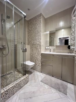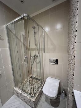 В апартаментах выполнен дизайнерский ремонт. Пространство оформлено со вкусом, чтобы вы могли наслаждаться уютом и комфортом. В кухонной зоне и комнате есть вся необходимая мебель. Техника включает современный кондиционер, холодильник, посудомоечную машину, телевизор и стиральную машину. В совмещенном санузле установлена душевая кабина. Окна выходят на тихую улицу, поэтому в квартире всегда светло и спокойно.