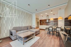 Планировка: кухня-гостиная с обеденной зоной и выходом на балкон, спальня с вместительной гардеробной, совмещенный санузел с душевой кабиной. Квартира полностью меблирована и оснащена всей необходимой бытовой техникой. Кондиционирование, подогрев полов, спутниковое ТВ, высокоскоростной интернет. Предусмотрено много мест для хранения вещей.