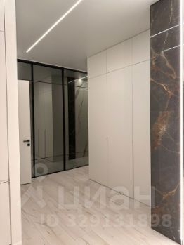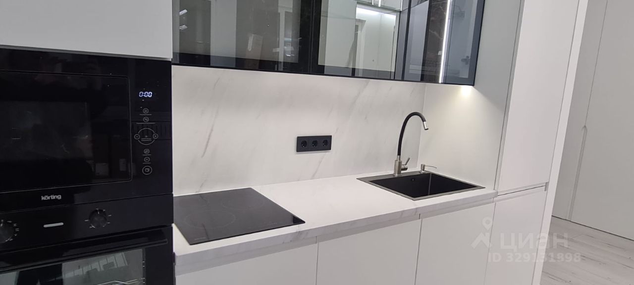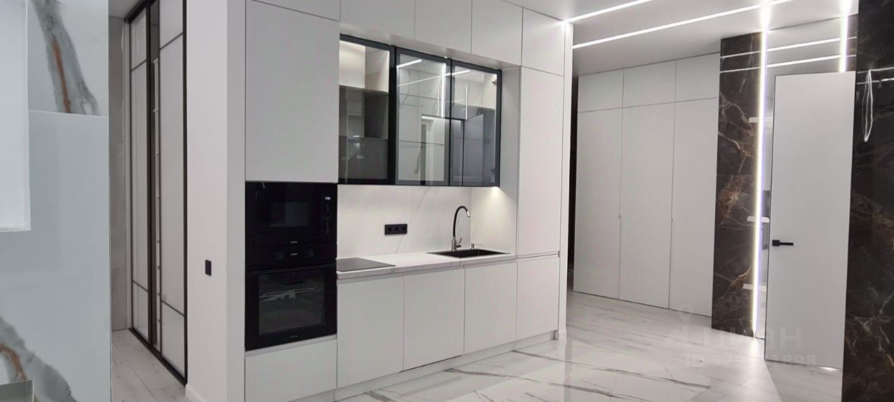 Кухонный гарнитур оснащен техникой (ПММ, ВП, ДШ, СВЧ, СМ). Парящая кровать с подсветкой, сенсорные выключатели, которые управляются при помощи Алисы, карнизная подсветка по всему периметру.